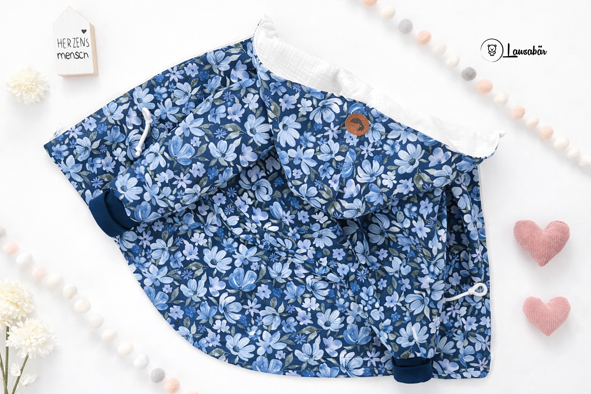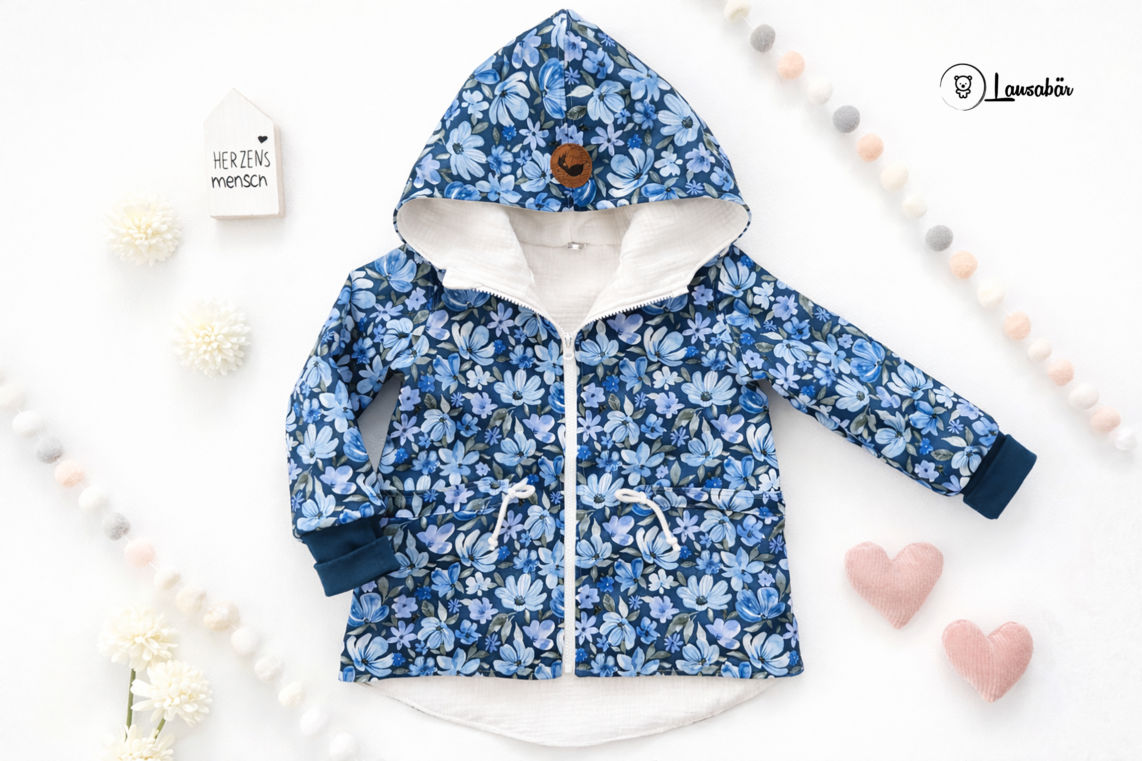 Mit dieser tollen Softshellparka startet ihr optimal in den Frühling. Die Jacke ist mit einem Musselinstoff komplett gefüttert. Der Parka ist aufwändig und sehr hochwertig vernäht, die Kanten wurden alle versäubert und abgesteppt. Besonders süß und praktisch ist der Kordelzug. Zusätzlich wurde ein süßes Lederpatch an der Kapuze vernäht.