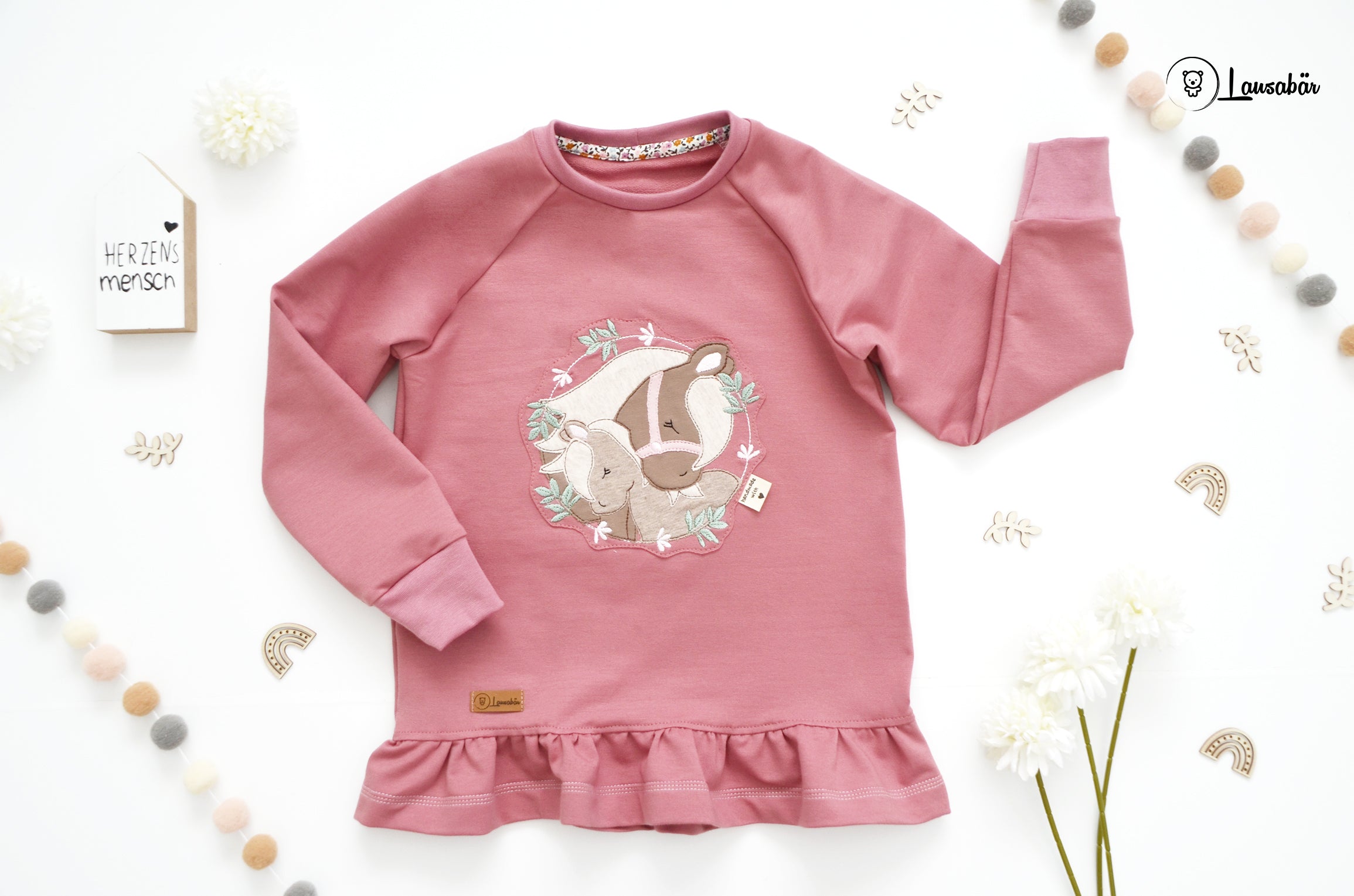 Ihr bekommt einen wunderschönen Sweater aus Sommersweat mit einem tollen Stickmotiv, dem süßen Kuschelhotties. Eine Besonderheit ist auch der kleine Volantabschluss. Der Schnitt ist locker geschnitten und perfekt als Alltagsbegleiter.